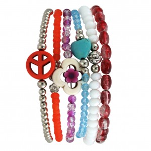 Die elastischen Armbänder sind auch einzeln tragbar. Die unterschliedlichen Armbänder bestehen aus Metall-Look Perlen, Rocailles Glasperlen, Crashed Beads, geschliffenen Glasperlen, verzierten Metallperlen, einer Fimoperle sowie verschiedenen Motivperlen in Form von Peace Zeichen, Blüten und Herzen. Möchtest Du Das Armband Set mit anderen Farben umgestalten so kannst Du die Perlen einfach austauschen.